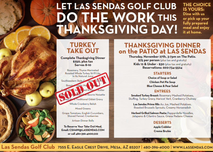 The Patio & Grille at Las Sendas 755 E Eagle Crest Drive, Mesa, AZ, United StatesLet Las Sendas Do the Work this Thanksgiving! Preparing a Thanksgiving dinner can be a lot of work—and stress. Give yourself a break this year and let Las Sendas Golf Club do the cooking. We offer two great options for those looking to stay out of the kitchen: Turkey Takeout Our “Turkey Takeout” is a […]