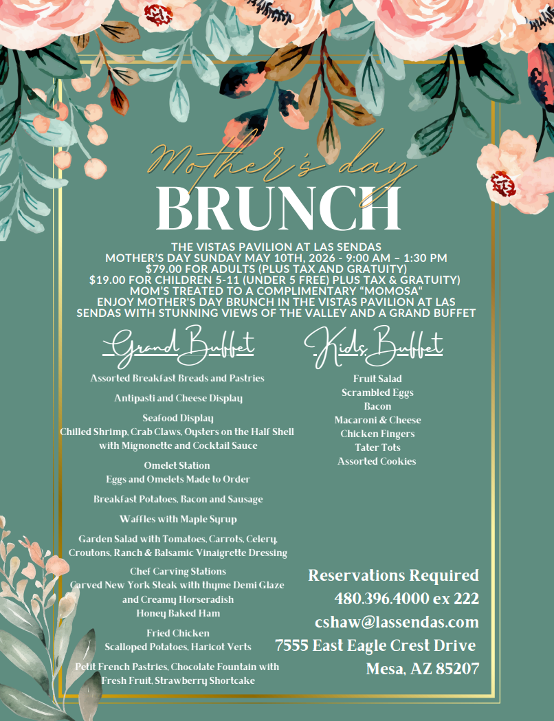 Pavillion 7555 E EAGLE CREST DRIVE, MESA, AZ, United StatesTreat Mom to a Wonderful Brunch with Stunning Views Looking to make Mother’s Day extra special for your mom? Our Mother’s Day Brunch at Las Sendas Golf Club is a great choice! Open to the public (reservations required), Mother’s Day Brunch at Las Sendas features great food, breathtaking views of the Phoenix Valley, and an […]